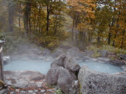 妙高は温泉地です。 燕温泉の露天風呂は硫黄 の臭いで深山の雰囲気です。 男女混浴ですが足だけでも どうぞ。 |